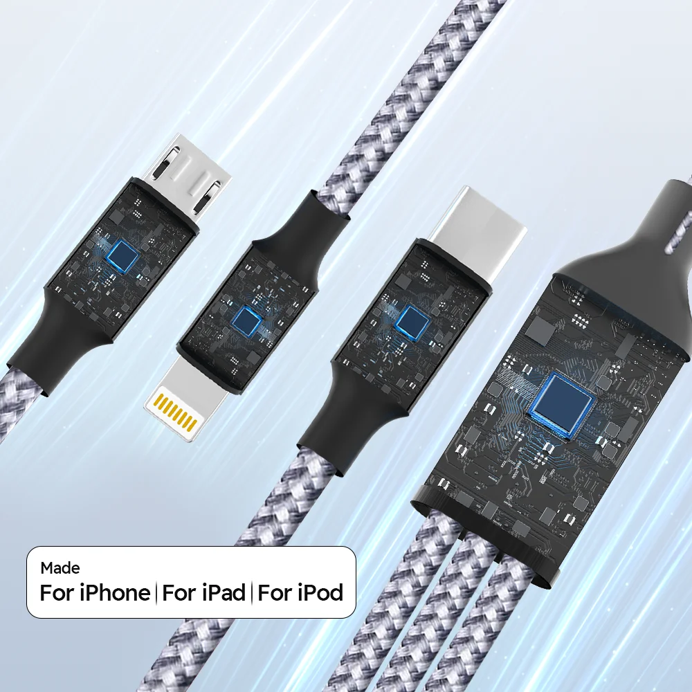 Made of dedicated military fibers and aluminum alloy, this 3-in-1 charging cable offers 200% increased tension, flexibility and durability. Braided nylon and stress relief design help multi-charger cables withstand 20,000+ bend tests to meet long-term daily use (up to 15-21 years of service life).