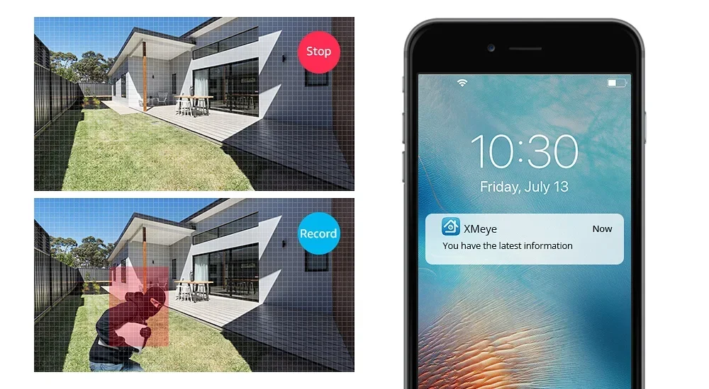 when motion is detected the NVR will save the footage into hard disk without missing any important events. You can even ensure that false alarms are avoided by setting the motion detection "mask" to block areas with constant movement.When Someone Breaks Into Shooting Area,The Camera Will Alarm Messages Will Be Pushed To Your Phone App